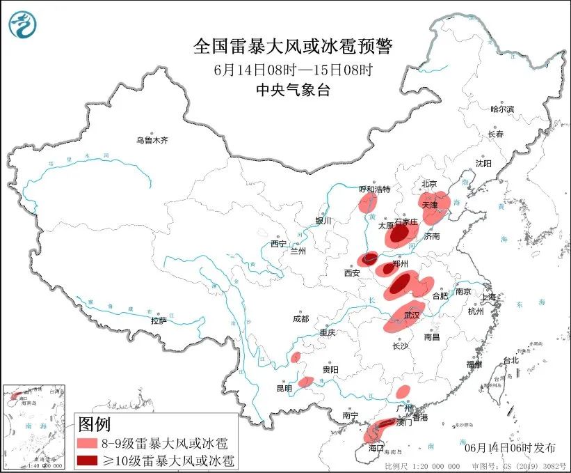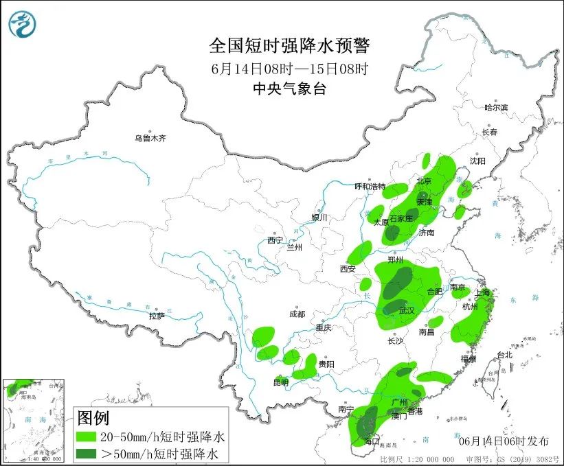 中央气象台6月14日06时继续发布强对流天气蓝色预警:预计6月14日08时至15日08时,西北地区东部、华北、黄淮、江汉、华南南部等地的部分地区将有8级以上雷暴大风或冰雹天气,其中,山西中南部、河北南部、河南南部和西部、湖北北部、广东西南部等地的部分地区将有10级以上雷暴大风,最大风力可达11级以上;西北地区东部、华北、东北地区南部、黄淮、江汉、江南地区东部、西南地区南部、华南等地的部分地区将有小时雨量大于20毫米的短时强降水天气,其中,山西南部、河北中南部、天津、河南东南部、湖北中东部、广东中西部等地的部分地区小时雨量大于50毫米,最大可达70毫米以上。