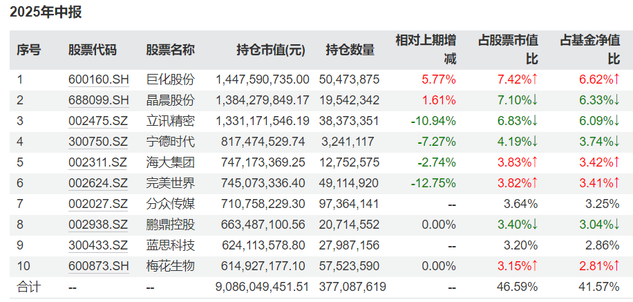 增减仓方面,主要减持了立讯精密、宁德时代、海大集团、完美世界,持股数增加的是巨化股份、晶晨股份。