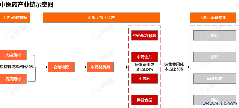 中药产业链中,上游产业主要包括中药种植业,下游产业包括医药流通和居民健康等行业,主要是中药消费市场,有医院、药店、部分超市和商店。从中药成本构成中,占据首位的是销售费用,成本占比50%左右,其次为中药原材料,成本占比30%左右。