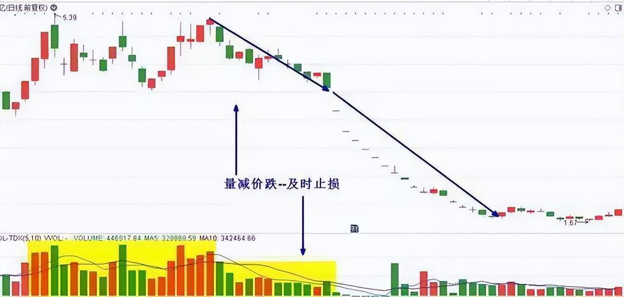 成交量停止减少,股价急速滑落,此阶段应继续坚持及早卖出的方针,不要买入当心\"飞刀断手\"。