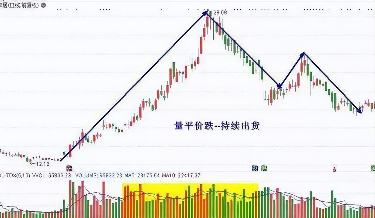 成交量显著减少,股价经过长期大幅上涨之后,进行横向整理不再上升,此为警戒出货的信号。此阶段如果突发巨量天量拉出大阳大阴线,无论有无利好利空消息,均应果断派发!
