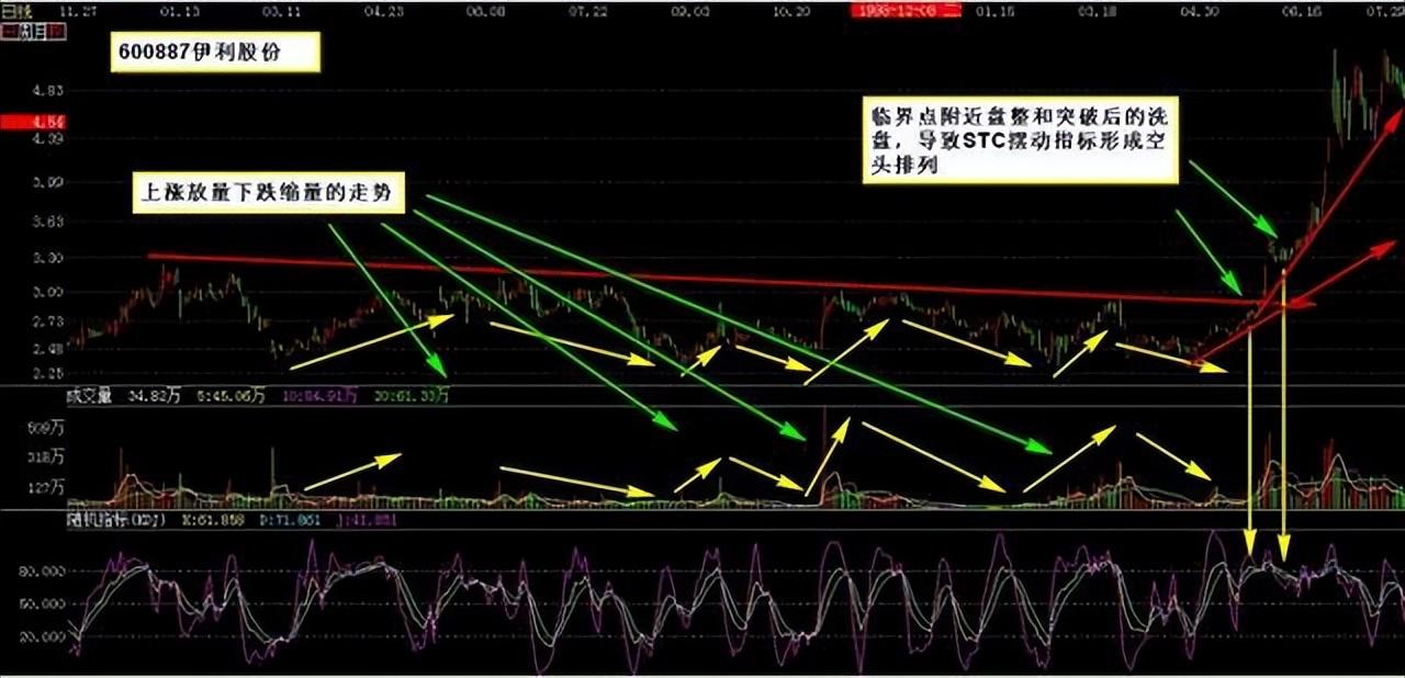 下面以600887伊利股份为例:震荡区间内上涨放量,下跌缩量,临界点突破前窄幅震荡以及突破后的洗盘时,KDJ、RSI等摆动指标恶化,出现死叉、顶背离等卖出信号,诱使所谓的技术派卖出,而后面股价却又上涨了70%。