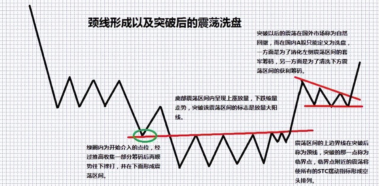 在临界突破颈线位时必须放量,因为颈线有一个上挤下压的作用,要突破颈线必须花相当大的代价,也就是用资金都接下来套牢及获利的筹码,所以必须产生放量。突破后一般会出现自然回撤(A股称为洗盘),然后再加速上涨,是否形成加速以及形成加速的过程取决于大盘所处的环境,所以我们必须左眼看大盘,右眼看个股。这也就能解释为什么有些个股为什么突破颈线位后没有上涨,因为当时大盘环境不行,覆巢之下安有完卵。